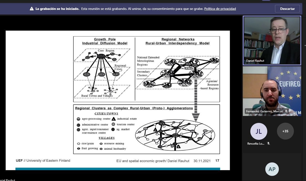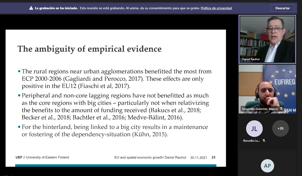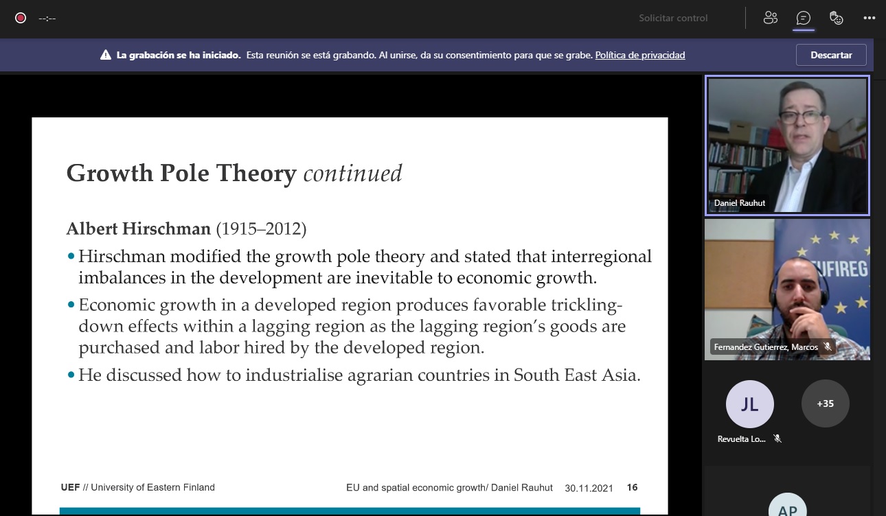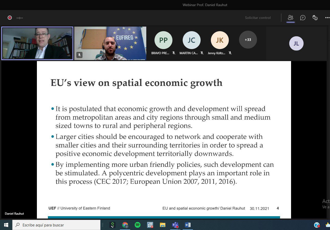 El webinar, al que acudieron alrededor de 40 asistentes, tuvo lugar el 30 de noviembre a las 13:15 horas. Estuvo basado en la investigación realizada por el Profesor Daniel Rauhut (ponente) en colaboración con el Profesor Alois Humer y abordó el principal pensamiento económico actual que influye en la Política de Cohesión de la Unión Europea.