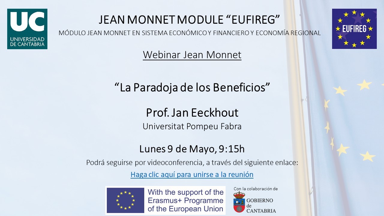 El lunes 9 de mayo a las 9:15 el catedrático Jan Eeckhout (Universitat Pompeu Fabra) impartió el webinar “La paradoja de los beneficios”. El webinar, organizado por el Módulo Jean Monnet en Sistema Económico y Financiero y Desarrollo Regional (EUFIREG) de la Universidad de Cantabria, se pudo seguir a través de Microsoft Teams. El profesor Eeckhout es uno … Leer más